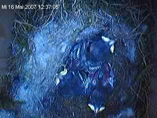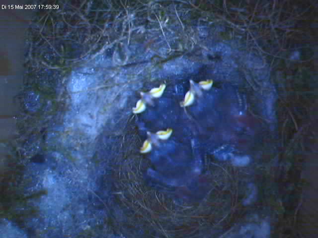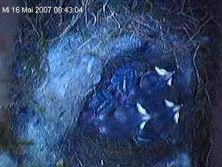 Leider hat es noch ein Külken erwischt. Gestern noch mopsfidel und heute ... Dabei sah alles doch recht gut aus. Alle drei gleich aktiv und gross. Beste Aussichten es zu schaffen und heute morgen ... (schnief). Das ist echt Auslese, Darwin. Naja jedenfalls hat das Küken jetzt alles hinter sich und kann sich im Vogelhimmel von den Strapazen erholen. mmmhh Terry Pratchet Leser zugegen? ... ob es wohl einen Vogel Tod gibt, der einen abholt? Wie der wohl aussieht? Die folgenden Bilder sind vom 15. und 16. Mai Also eigentlich sollte man meinen, dass sie noch gesund sind, so wie sie schreien. ![]() Wachsen tun sie auch gut. Mal wieder einen guten Blick auf das Federkleid. ![]() Lustig ist auch immer mal wieder der Formationstanz den die Lütten ausführen. ![]() ![]() ![]() ![]() ![]() ![]() weiter zum 18.05.2007 |