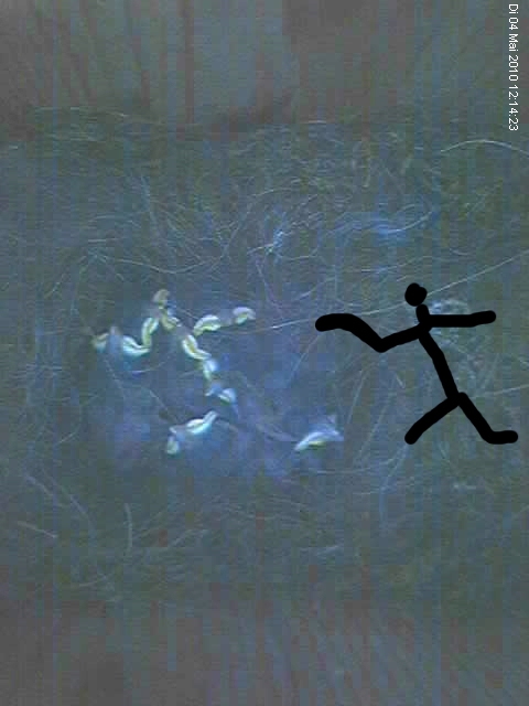 SENSATION! Heute ist es genau eine Woche her, dass die Küken geschlüpft sind, und 87,5% sind 100%ig noch da. Ist das nicht toll? Also verglichen mit meinem Horrorjahr 2007, als nach sieben Tagen nur noch drei da waren, ist das eine Verbesserung um über 133% bzw um 2 1/3 oder einer Verringerung der Verluste um 400% bzw auf 1/5... Zahlenakrobatik... Die Küken von Else und Fränki sind übrigens ausserordentlich intelligent und koennen schon erste Spielchen spielen und die ersten Buchstaben des Alphabets (noch nicht perfekt) und erste Zahlen Die 6 ![]() Das kleine e ![]() Ausserdem die 9 ![]() und wenn man genau hinsieht, kommunizieren die Kleinen schon in Form von Piktogrammen mit mir oder wem auch immer... Hier wollen sie z.B., dass ich den Gong schlagen soll. Warum, weiss ich nicht. ![]() Hier zeigen sie mir einen Skorpion. Was das wohl bedeuten soll? Die werden in ihrem ganzen Leben nie einem begegnen. Oder meinen die einen Kran? ![]() ![]() Oder der Bumerangwerfer... Was wollen die mir bloss sagen?? ![]() Aber nun zu der schon seit langer Zeit angekündigten wissenschaftlichen Pioniertat. Ich habe nach Durchsicht der mittlerweile auf über 5000 Bilder angewachsenen Datenbank herausgefunden, dass die Tiere einen Sinn für die Zeit haben. Wie - ihr seid nicht begeistert? Ich meine auch nicht einfach hell = Tag, dunkel = Nacht. Wenn man sie ganz genau beobachtet und alle Bilder über die Zeit mittelt, zu bestimmten Zeiten und so, dann kann man was Erstaunliches herausfinden. Wollt ihr es wirklich wissen? Dann folgt diesem Link. jüngstes Bild letzten 30 Bilder weiter zum 07.05.2010 |